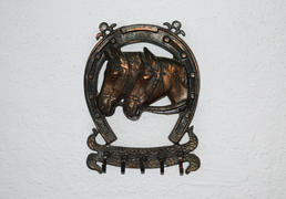 Вешалка для одежды украшенная изображением подковы и головы лошадей.
