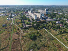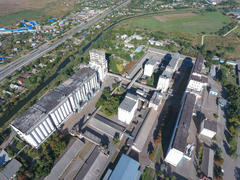 Аэросъемка. Вид сверху на элеватор. Огромное здание для хранения и сушки зерна.