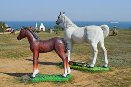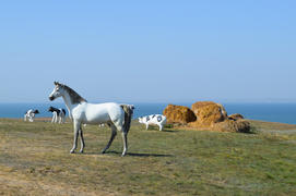 Белый конь. Фигуры лошадей сделаны из пластика на лужайке.