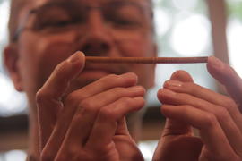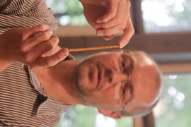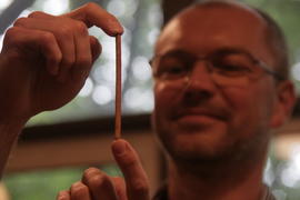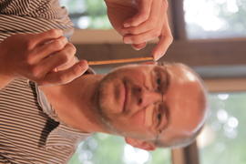 300-летняя лиственница. Девушка позирует у ствола дерева