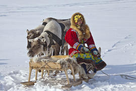 Хантыйка на нартах с оленями