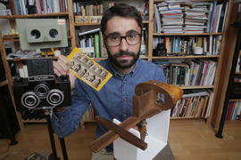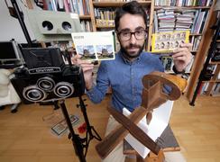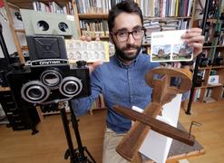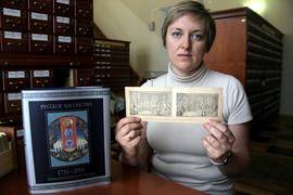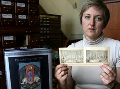 Историк Роман Шмидт демонстрирует открыики и фотографии с памятниками архитектуры