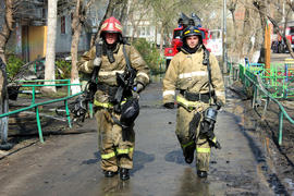 Пара пожарных идет по улице после тушения пожара
