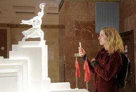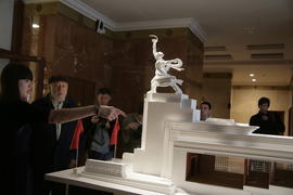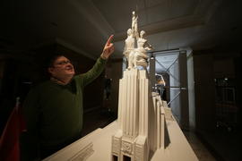 Директор австрийского культурно форума Симон Мраз у макета советского павильона в Париже.