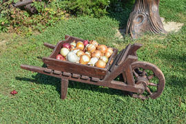 Репчатый лук в деревянной телеге