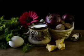 Натюрморт с молоком в горшочке