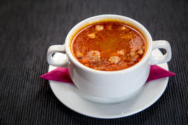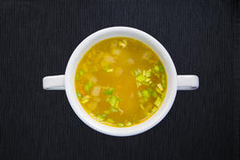 Tasty hot broth with meat and green onions