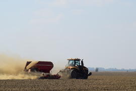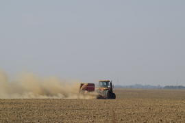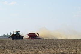 Russia, Temryuk - 19 July 2015: Tractor rides on the field and makes the fertilizer into the soil. C