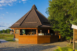 Bar on the shore of the lake near the forest. Family fun and fishing