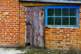 Старые неокрашенные, разрушенные и обветшалые двери в кирпичном сарае