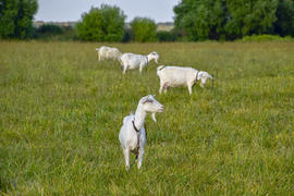 Goats grazing in the meadow. White goat dairy cattle eating grass in a pasture.