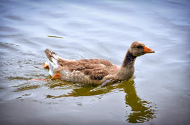 Один молодой серый гусь плывет по речке
