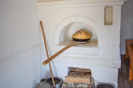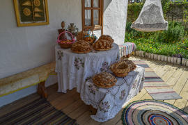 Стол с противнем с хлебом. Различные буханки хлеба на столе.