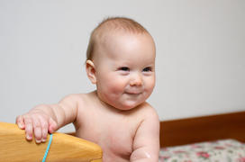 Улыбающийся малыш держится за стул