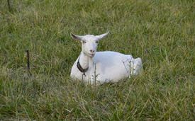 Goats grazing in the meadow. White goat dairy cattle eating grass in a pasture.