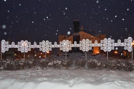 Желтоватый свет ламп накаливания в сумерках на улице.