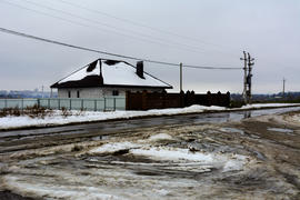 Недостроенный частный дом, стоящий вдоль дороги в зимнее время