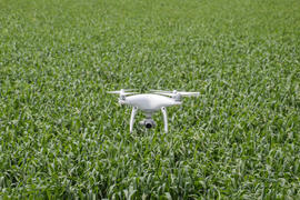 Flying white quadrocopters  over a field of wheat. Flying gadget for video.