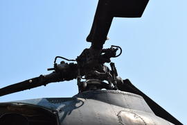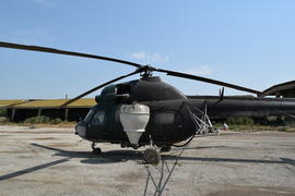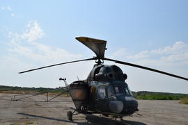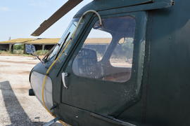 Old helicopter spraying fields. Helicopter spraying fertilizer.