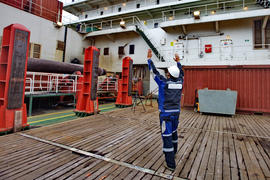 Грузовой порт с портовыми кранами. Морской залив и горные побережья.
