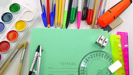тетрадь, ручки, фломастеры, краски,циркуль, транспортир на белом фоне
