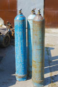 Old rusty oxygen cylinders in an abandoned factory in the industrial zone