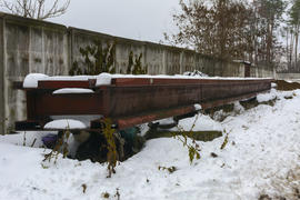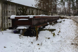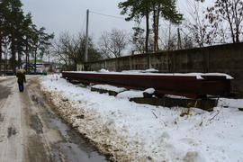 Большой стальной рельс, лежащий возле дороги в зимнее время