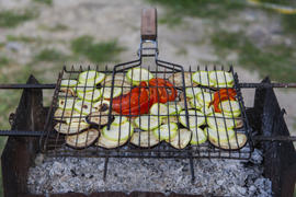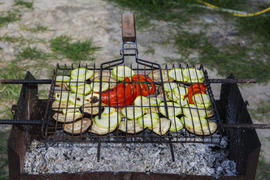 Pickled vegetables grilled over charcoal on the grill
