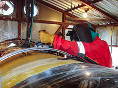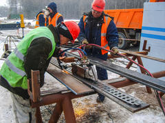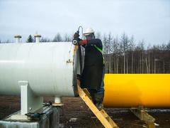 Сварка и монтаж трубопровода. Сварщики промышленные рабочие и монтажники.