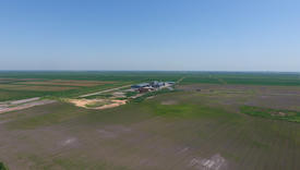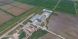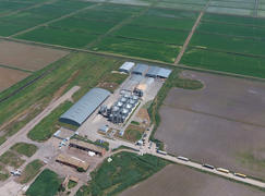 Plant for the drying and storage of grain. Rice plant in the middle of fields. Top view.