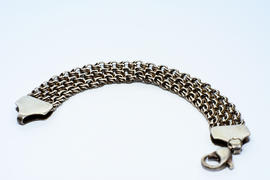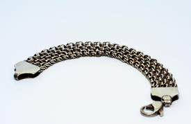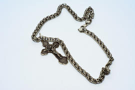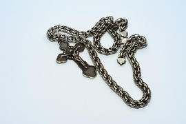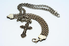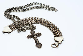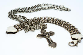 Браслеты, цепочки и кресты из серебра на белом фоне