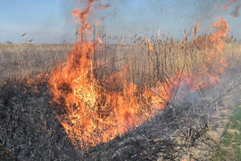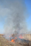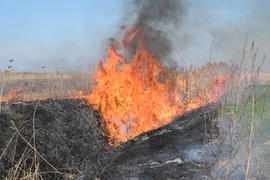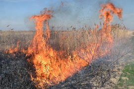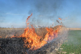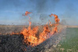 Burning dry grass and reeds. Cleaning the fields and ditches of the thickets of dry grass