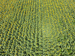 Field of sunflowers. Aerial view of agricultural fields flowering oilseed. Top view.
